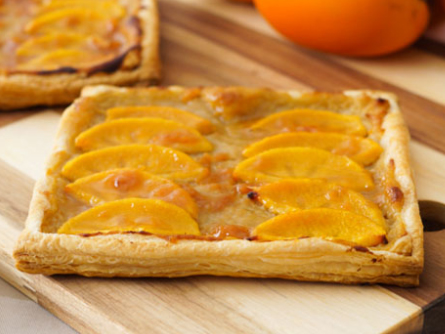 14. Calienta algo menos de medio vaso de mermelada en el microondas. Dale apenas unos segundos ya que puede explotar con facilidad, simplemente haz esto para que la textura esté un poco más líquida pero no es necesario que se caliente demasiado.Pinta las láminas de caqui de las tartaletas con la mermelada utilizando un pincel de cocina